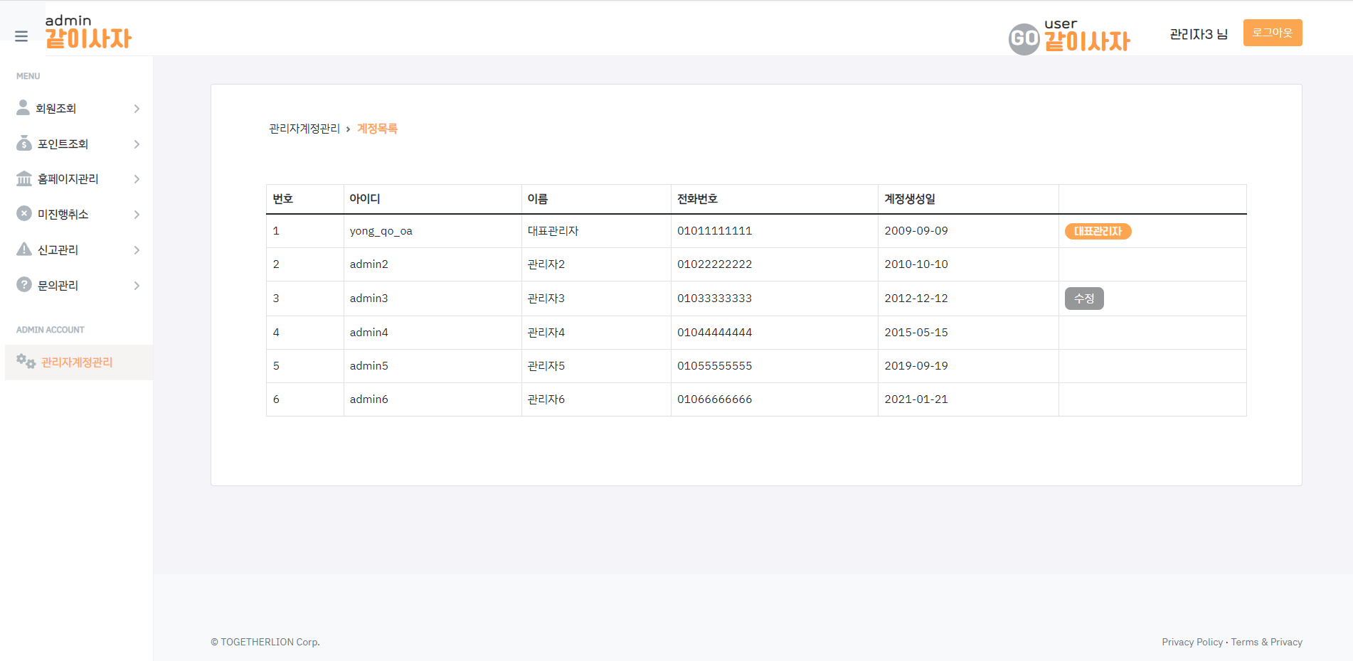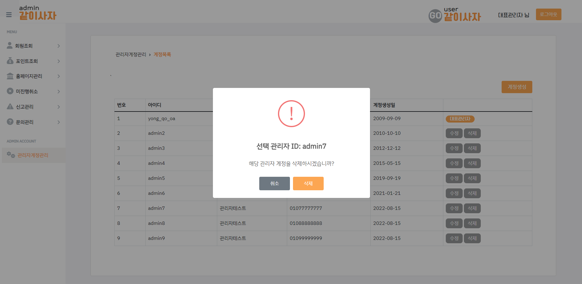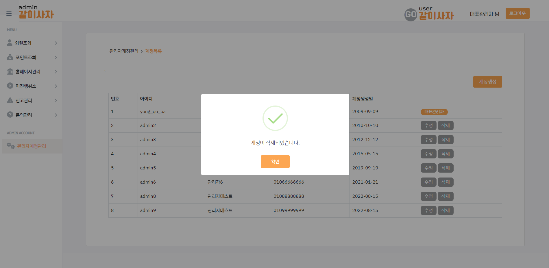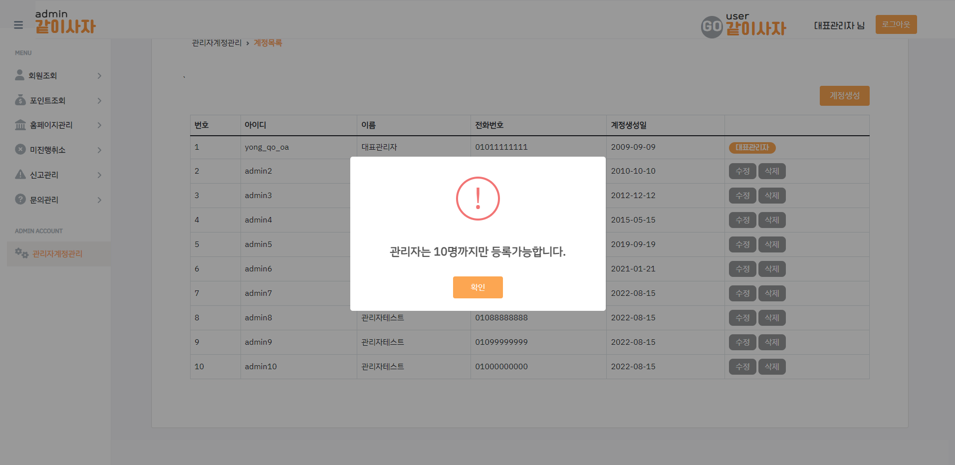 대표관리자 → <계정생성>버튼 및 모든 일반관리자 계정의 <수정><삭제>버튼 활성화되어 있음