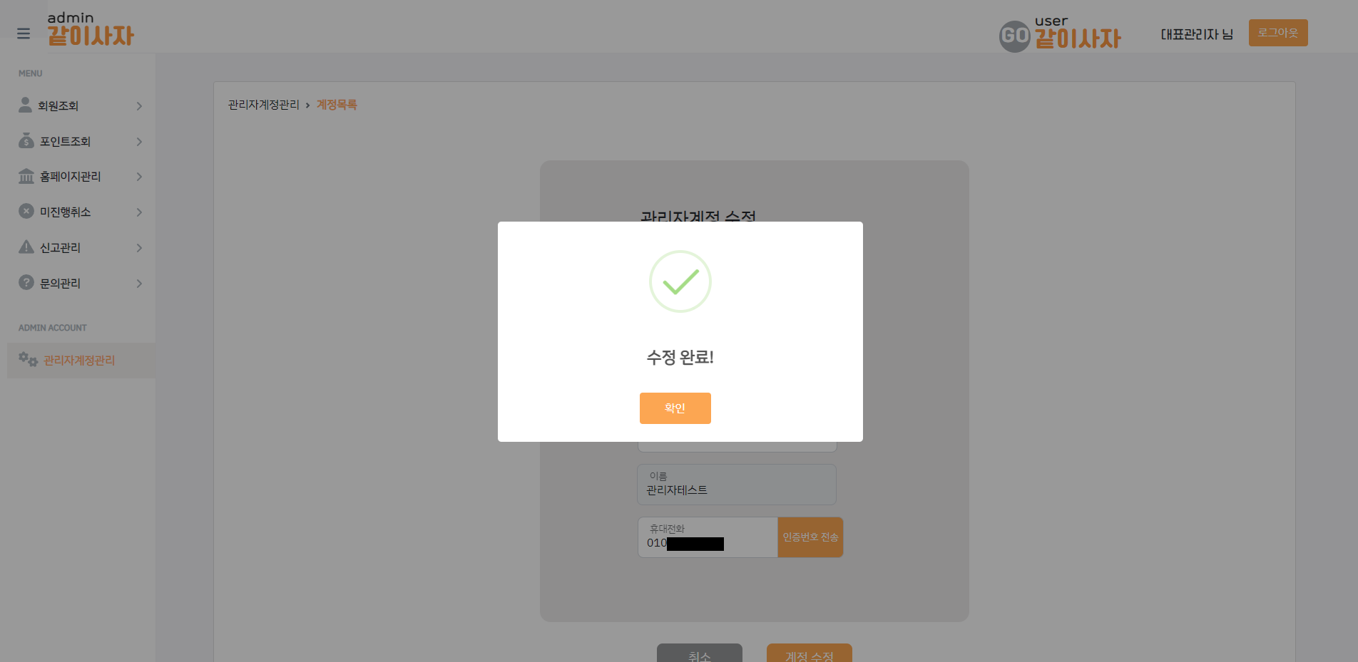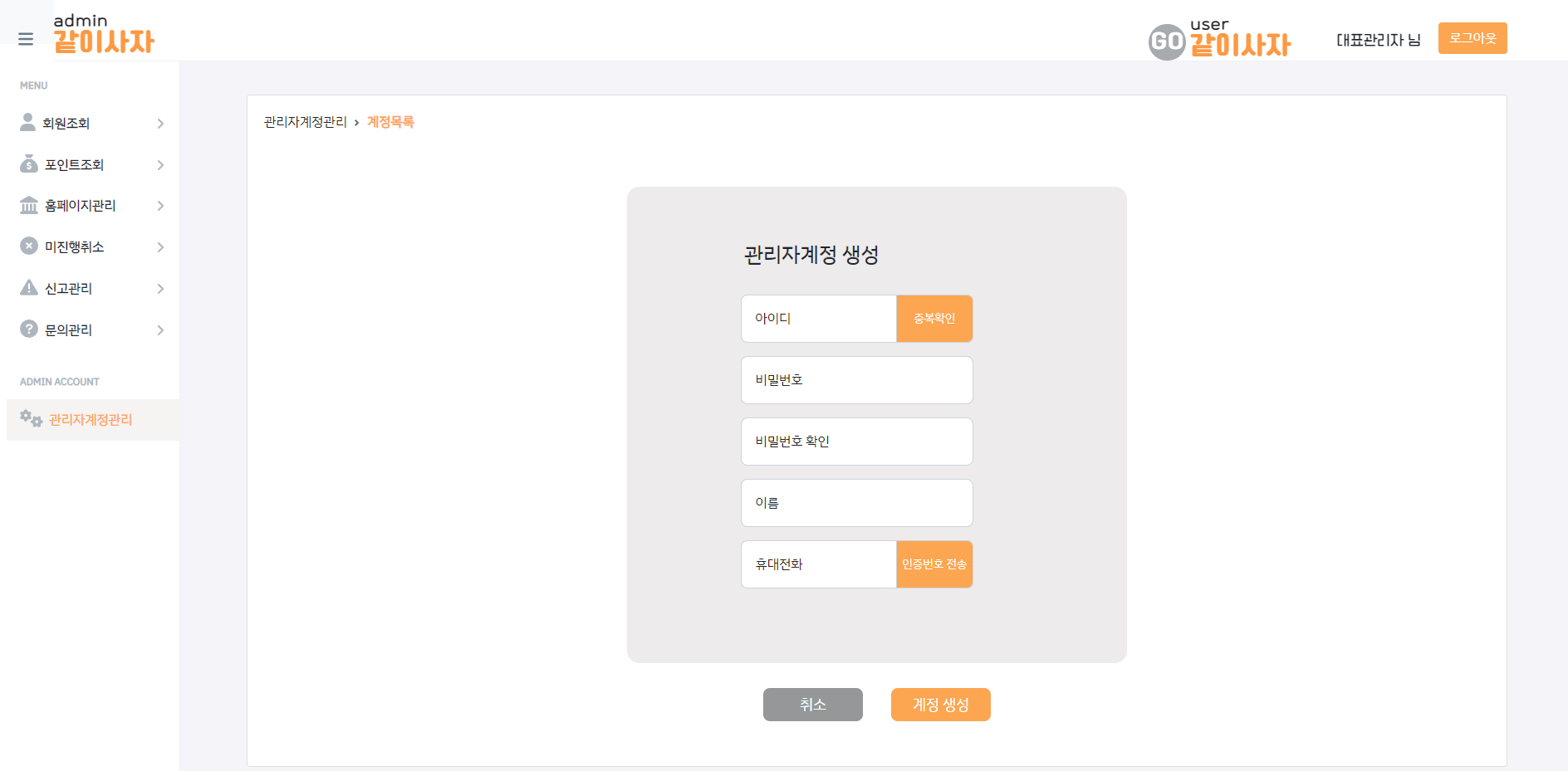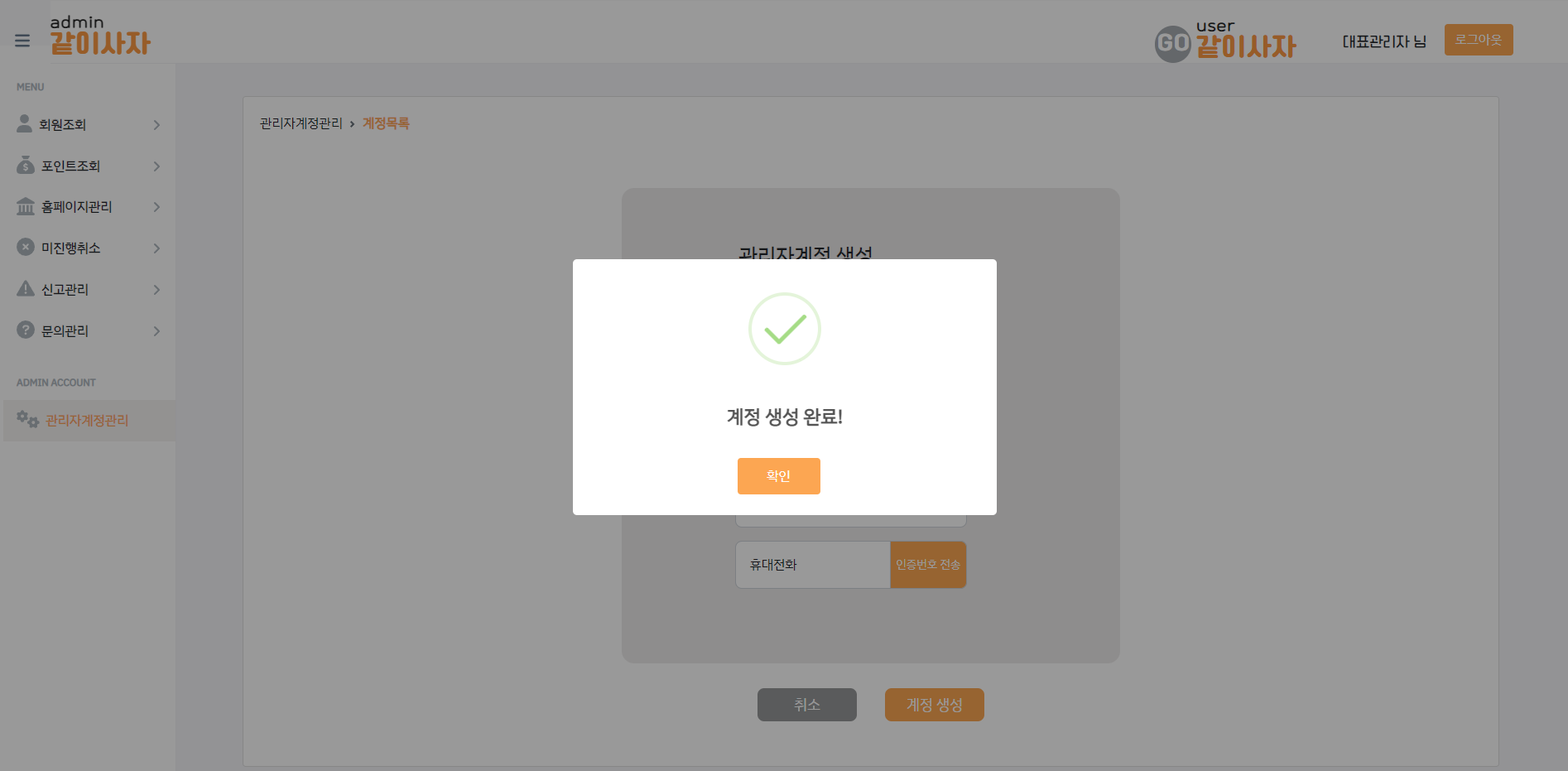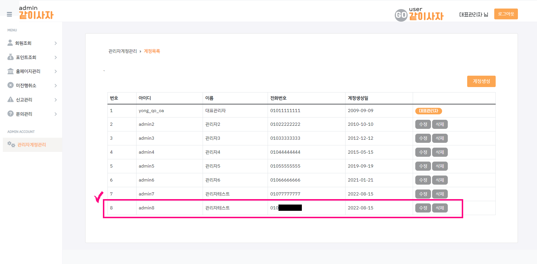 대표관리자 → <계정생성>버튼 및 모든 일반관리자 계정의 <수정><삭제>버튼 활성화되어 있음