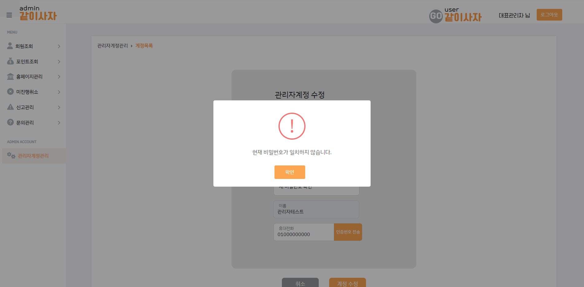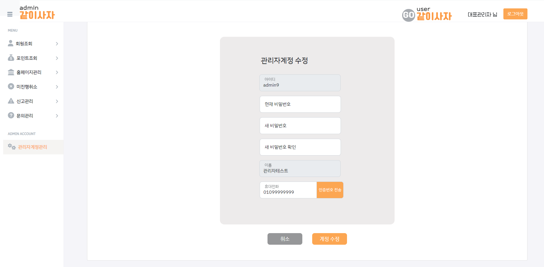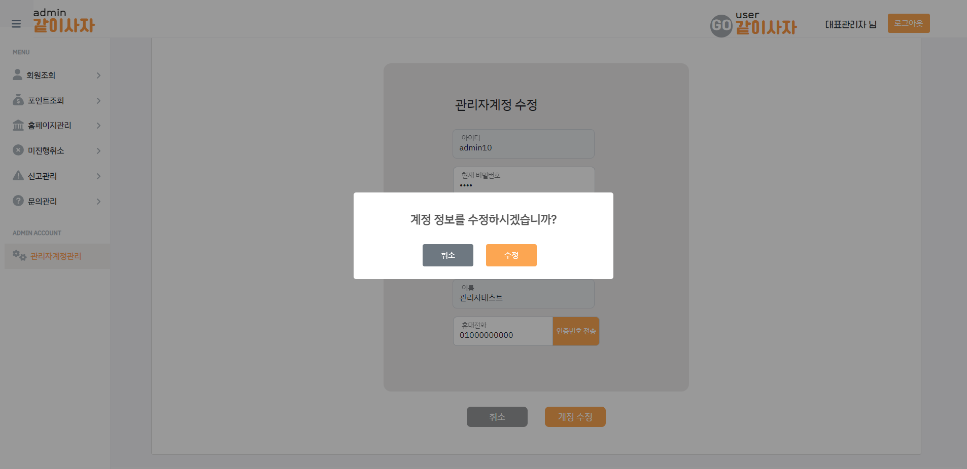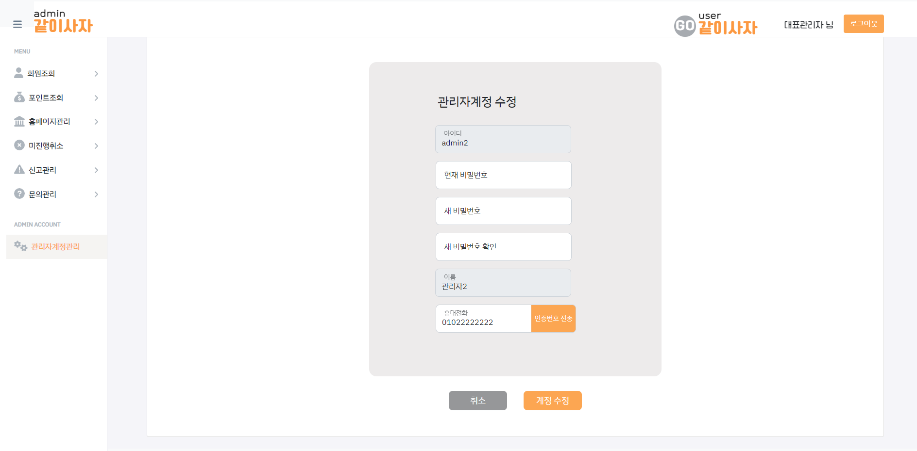 대표관리자 → <계정생성>버튼 및 모든 일반관리자 계정의 <수정><삭제>버튼 활성화되어 있음