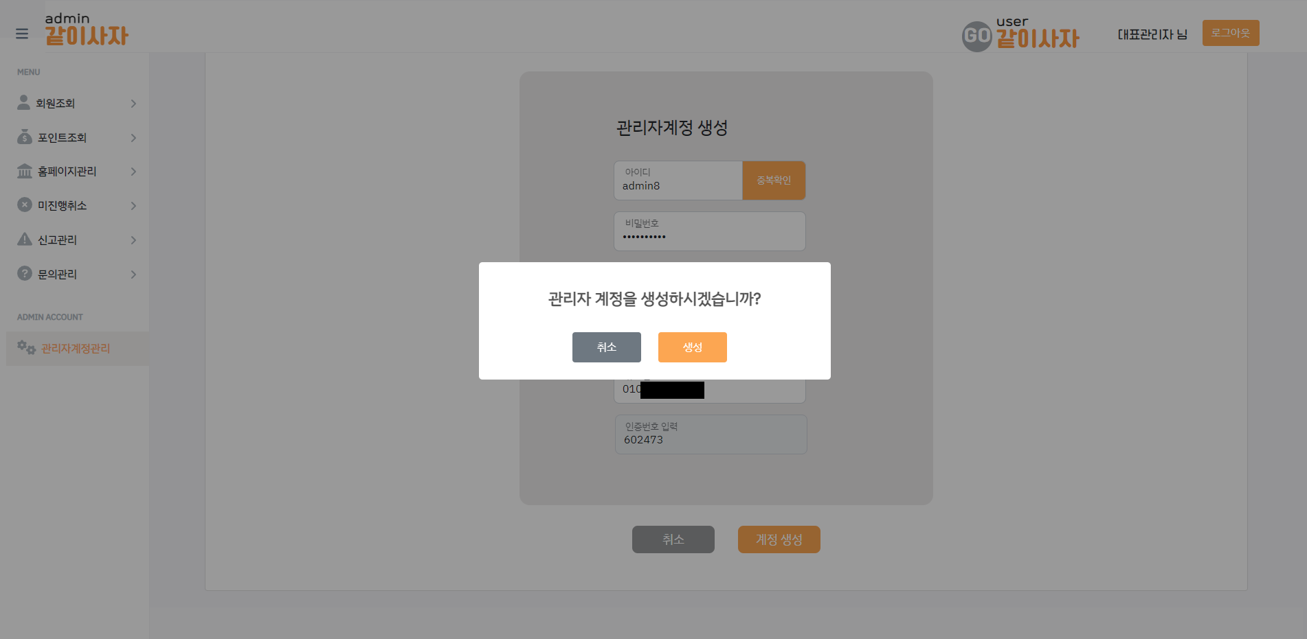 내용을 제대로 작성한 후에, <계정생성>을 클릭하면 확인 알림창이 뜬다.