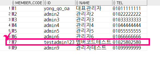 여기서 새로운 관리자를 넣으면 의도대로라면 MEMBER_CODE = M7로 들어가면 된다!