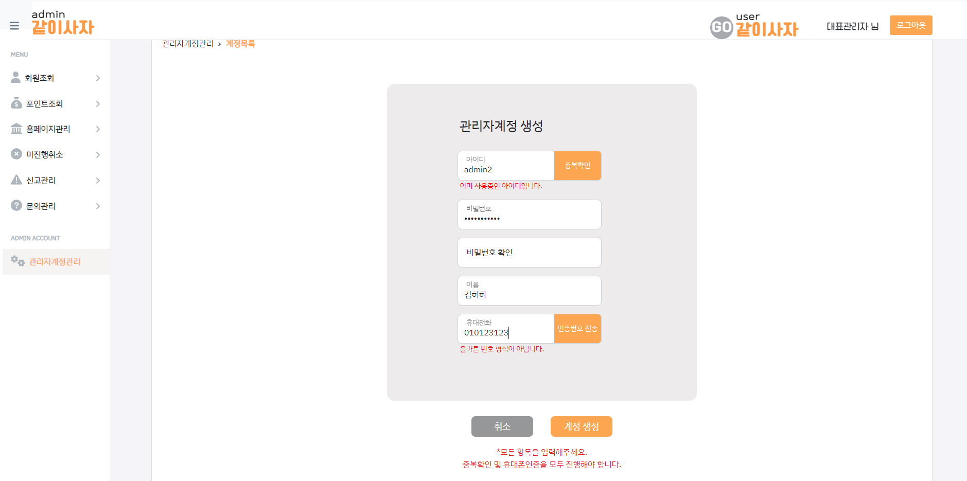 -대표관리자는 다른 모든 관리자들의 정보 수정 및 삭제 가능 / 일반 관리자 계정 생성 가능