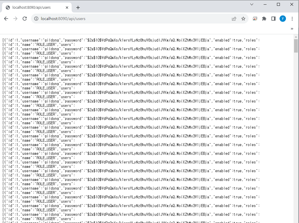 그래서 웹브라우저에 해당 url을 입력해봤더니, 현재 DB에 User 테이블에는 한 명만 있는데,