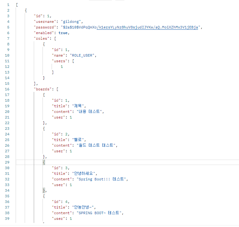 다시 Postman으로 테스트를 진행하니, gildong에 대한 정보와 gildong이가 쓴 Boards 리스트까지 잘 불러와졌다!