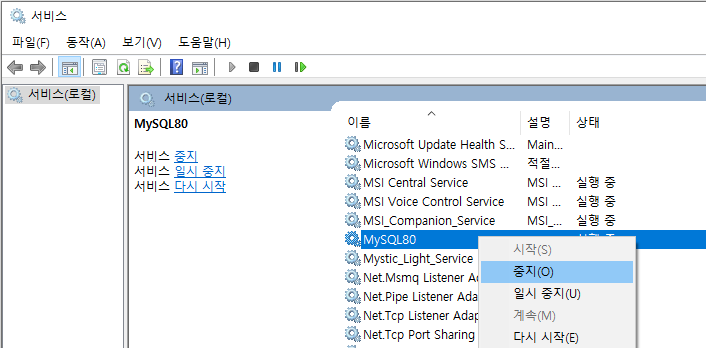 서비스에서 MySQL80을 찾아서 서비스를 중지한다.