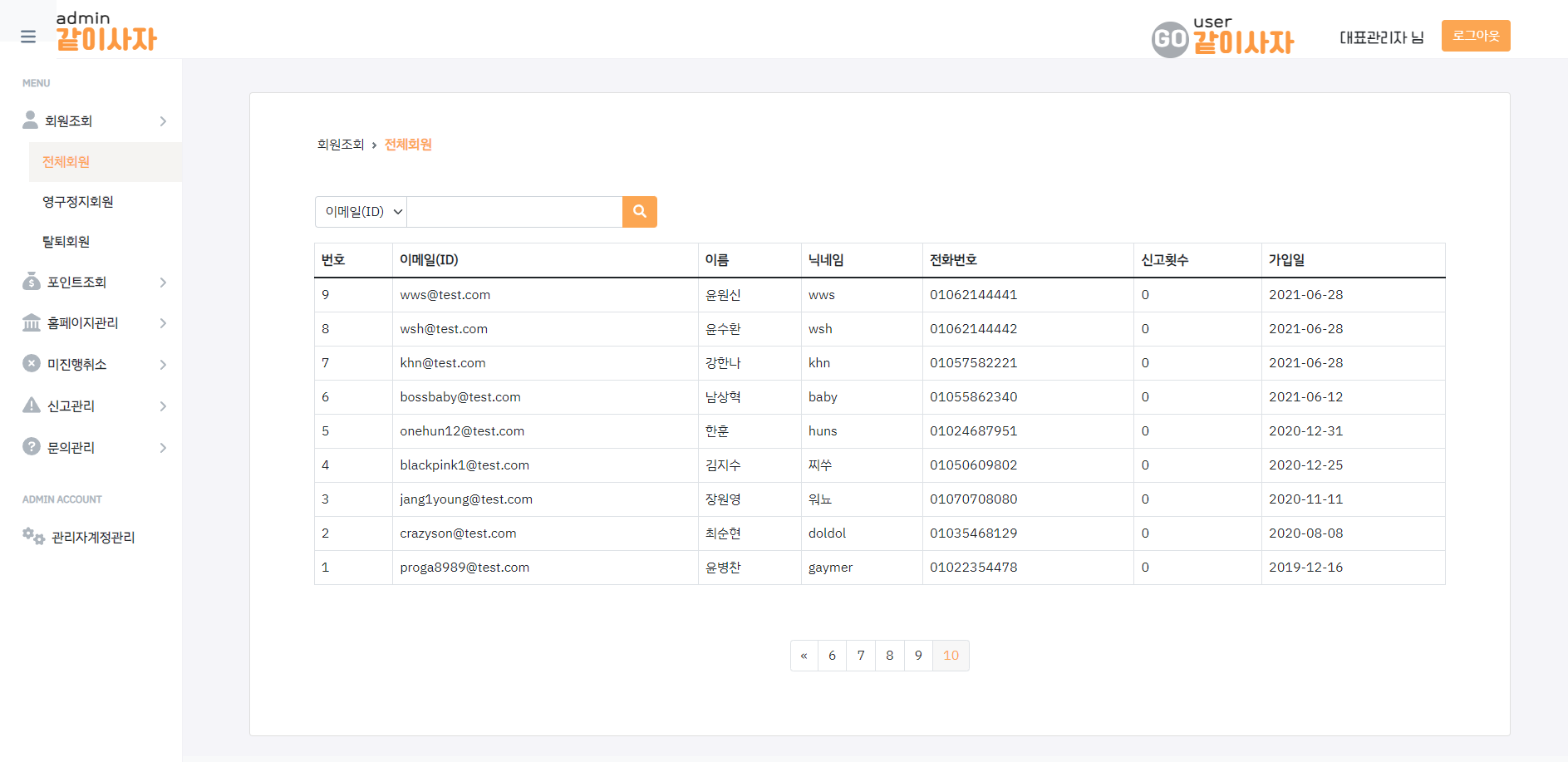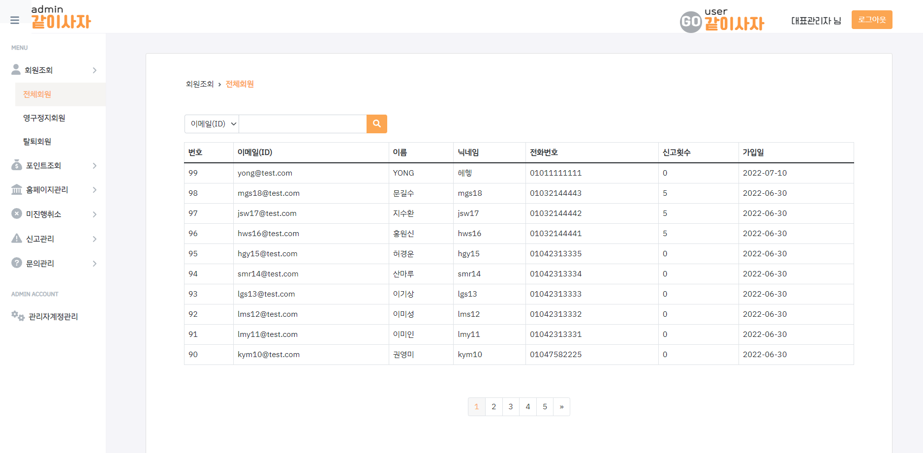 한 페이지당 10명의 회원 정보를 볼 수 있고, 페이지목록은 5개씩 보여진다.