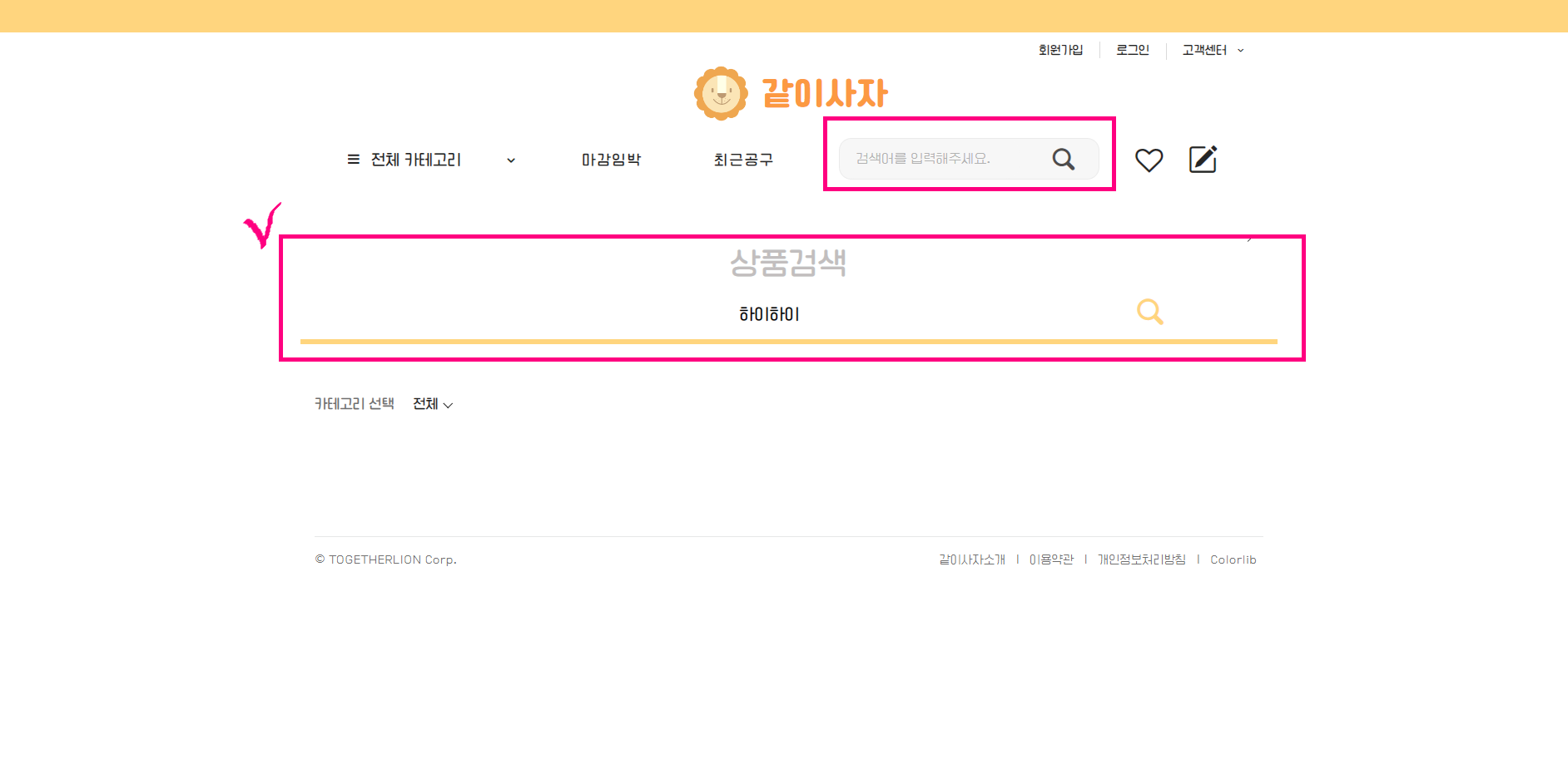 모든화면에서 따라다니는 헤더의 검색창을 통해 공동구매 게시물을 검색할 수 있다.