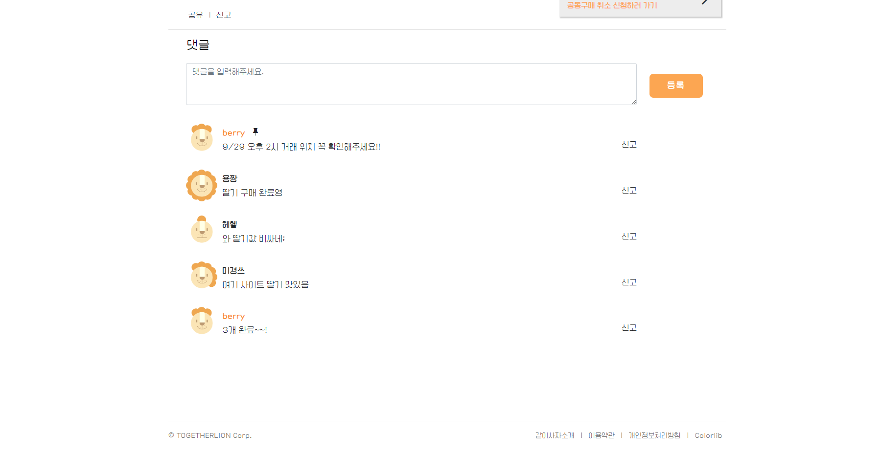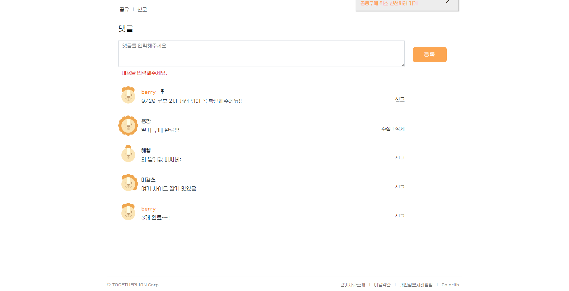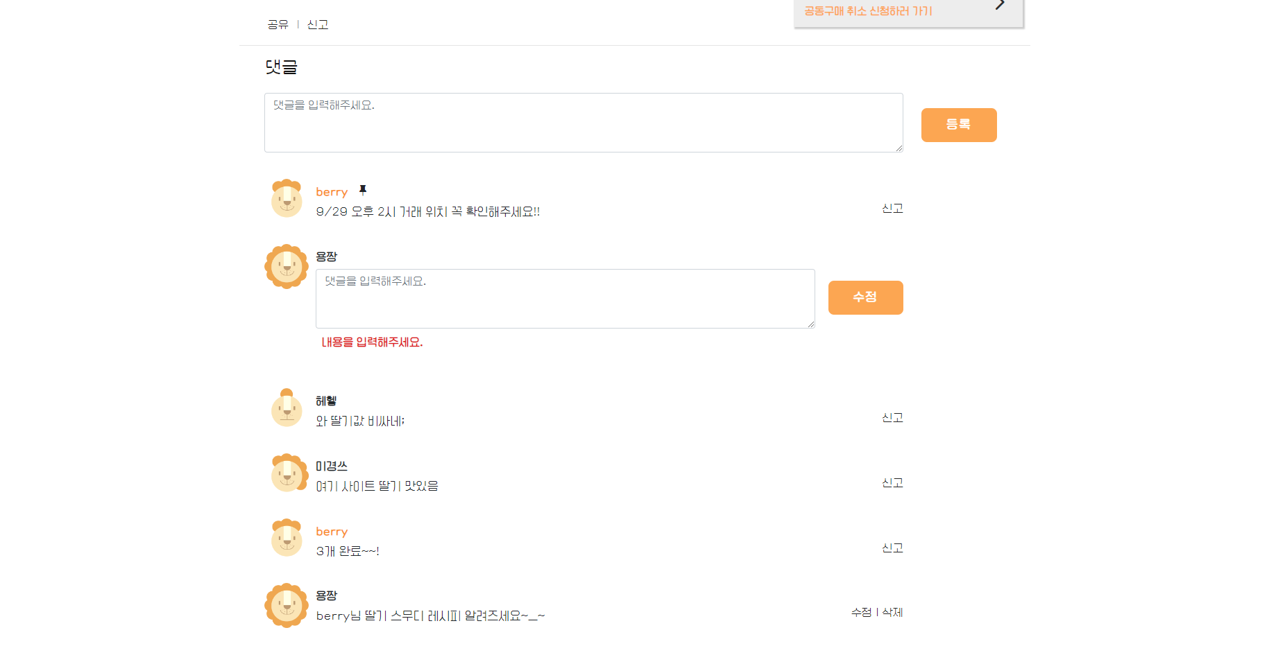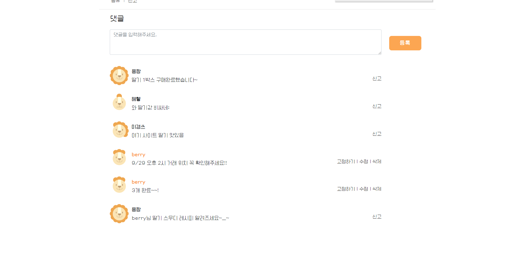 코드 처리를 마친 딸기 공동구매 게시물의 댓글 목록을 보면,