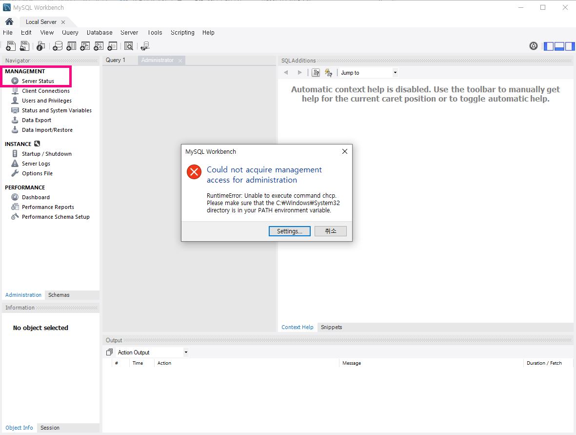 My sql workbench 에러해결 : could not acquire management access for administration