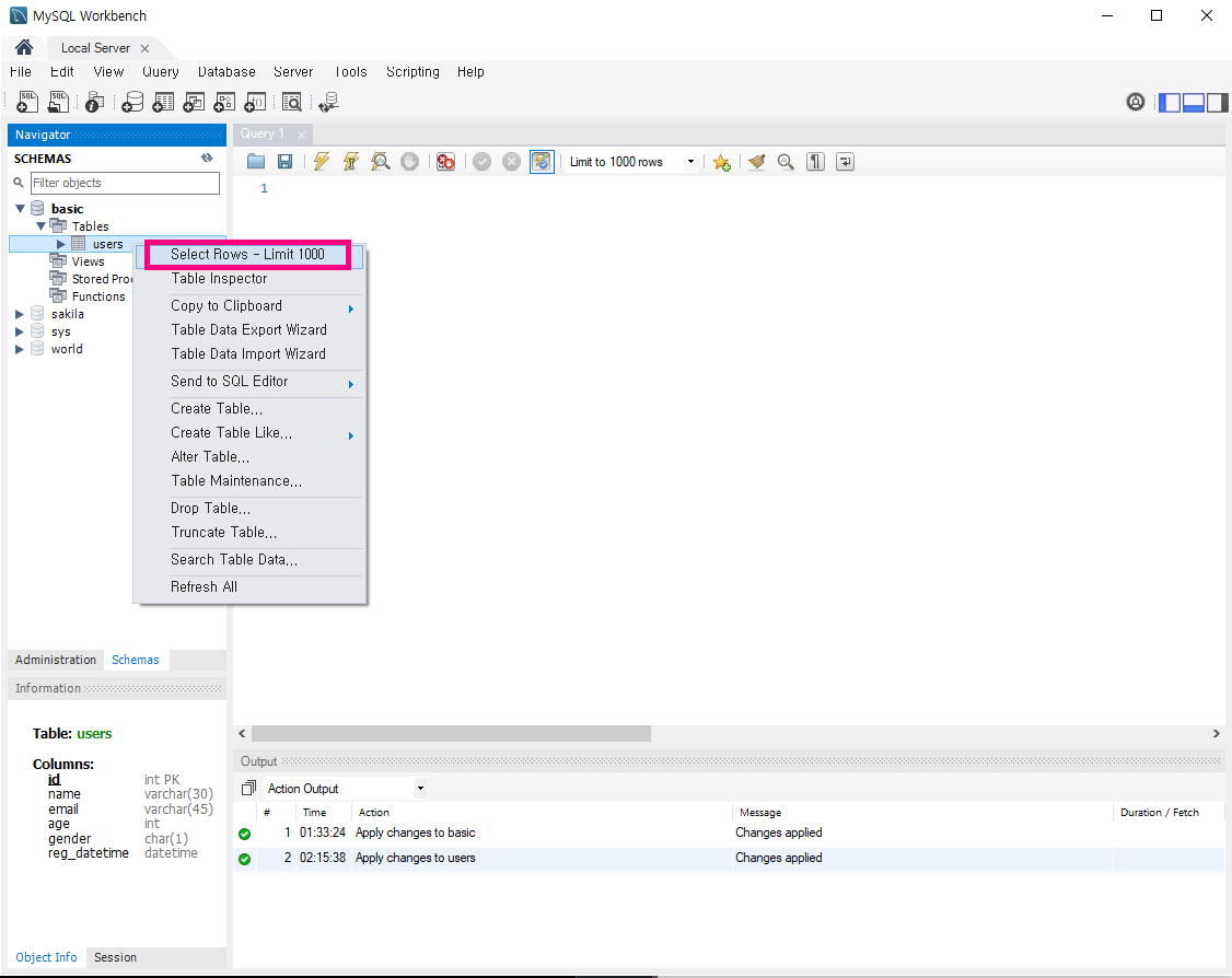테이블 생성 후, 생성된 테이블에서 우클릭 > [Select Rows - Limit 1000] 클릭해보자