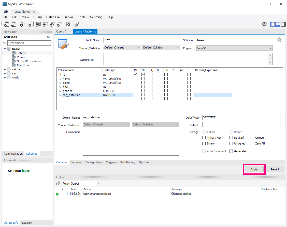 - Column Name, Datatype, Option 설정한 다음에, [Apply] 클릭