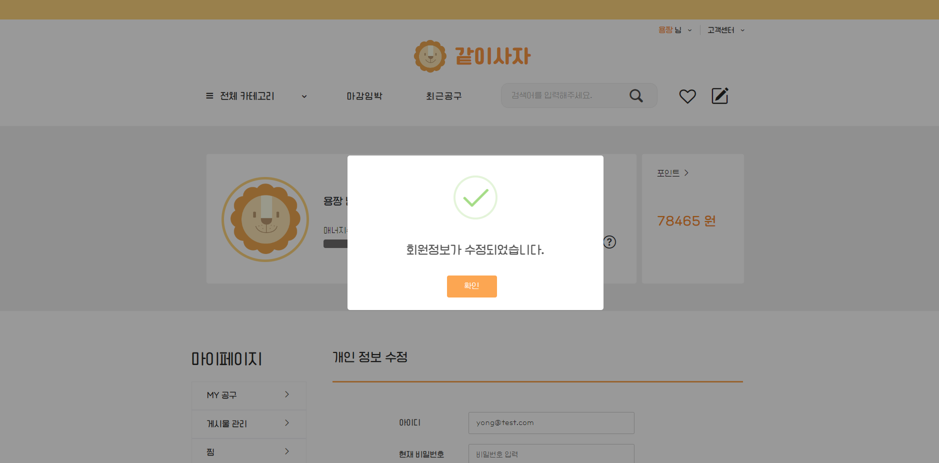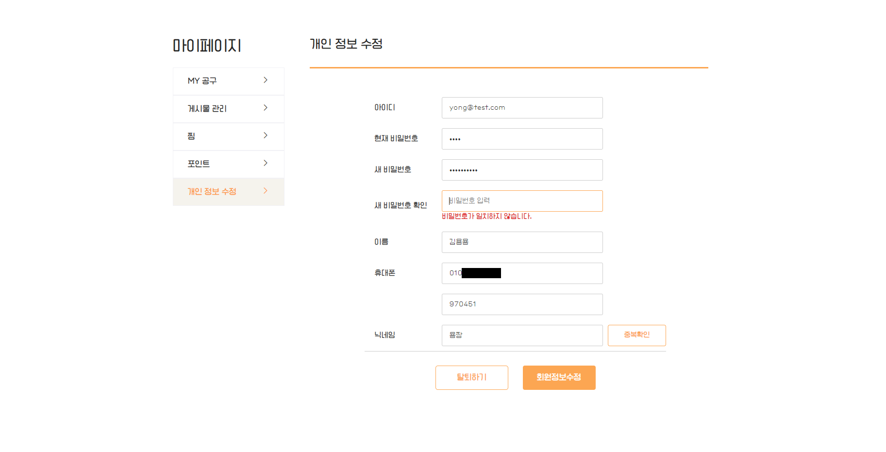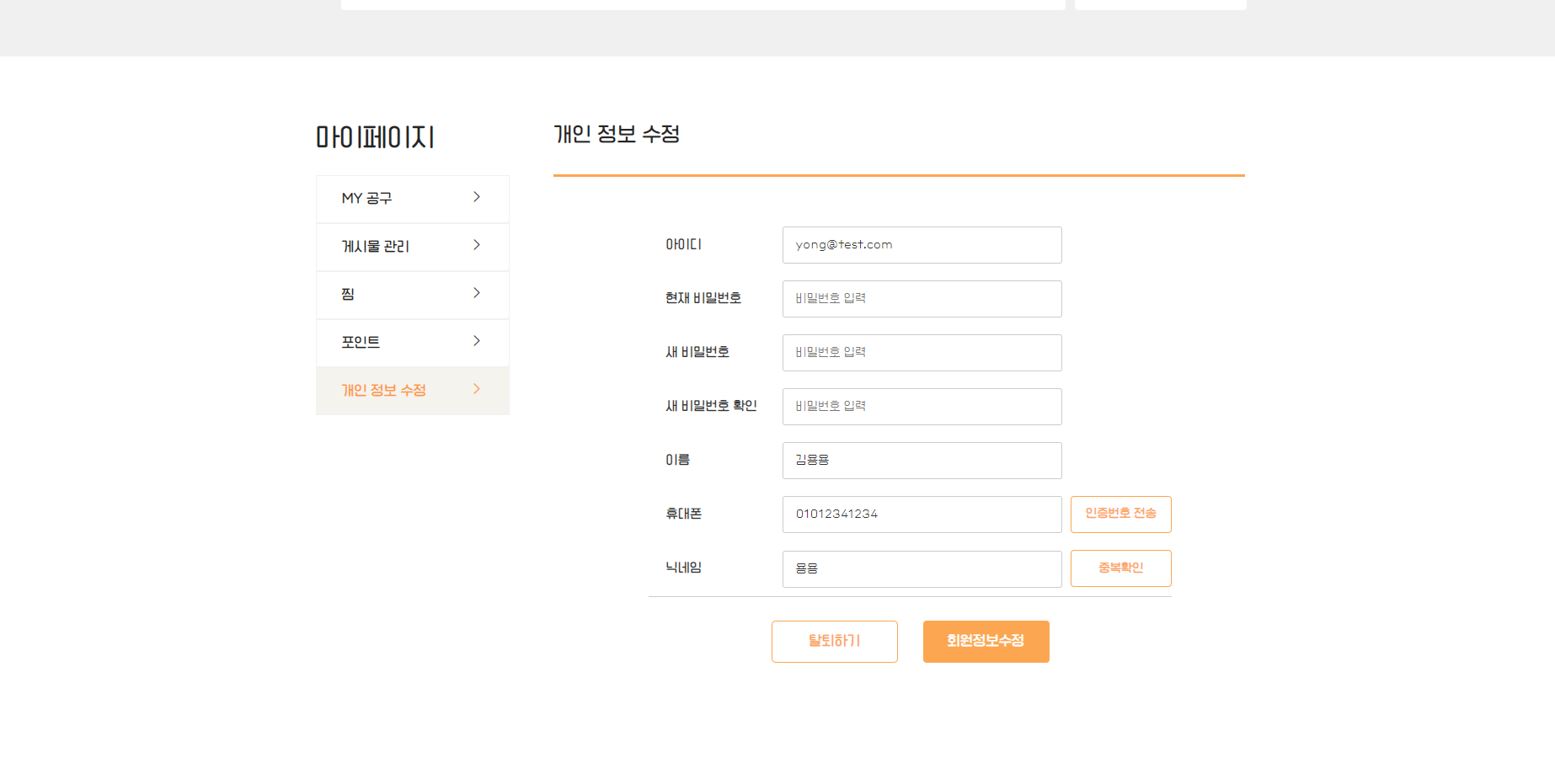 마이페이지 메뉴바에서 개인정보수정을 누르면, 회원의 비밀번호를 확인한 후에 개인정보수정폼으로 이동한다.
