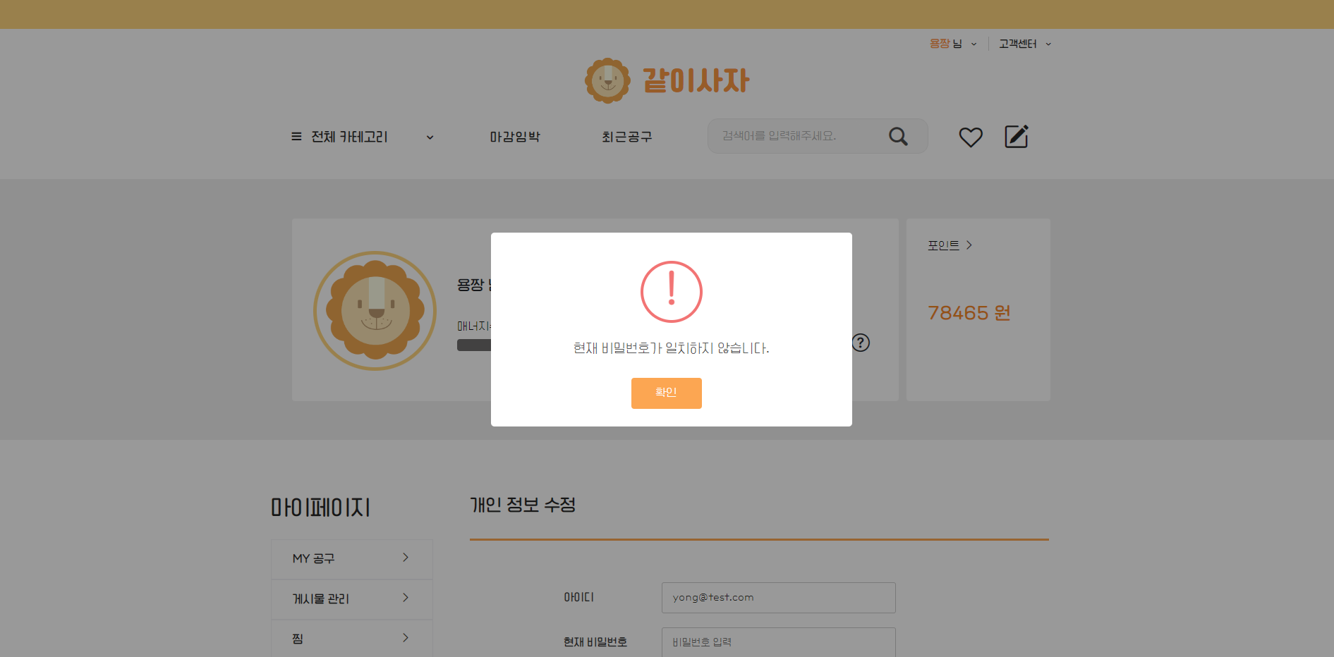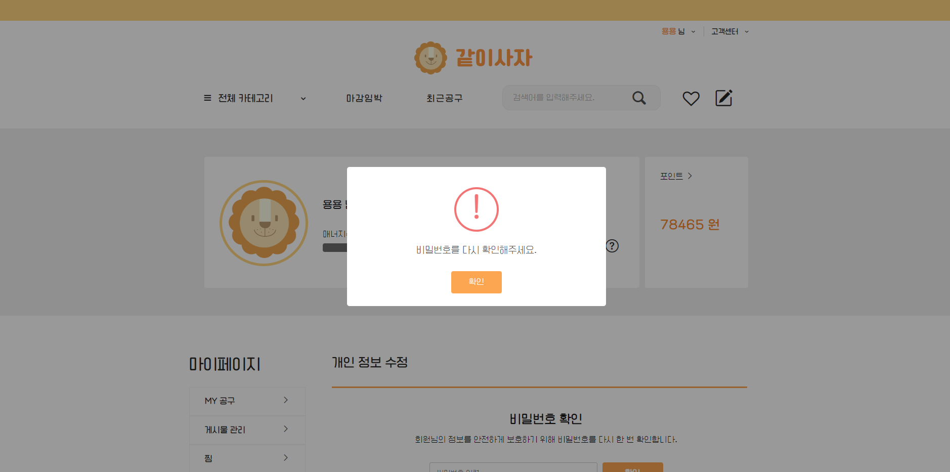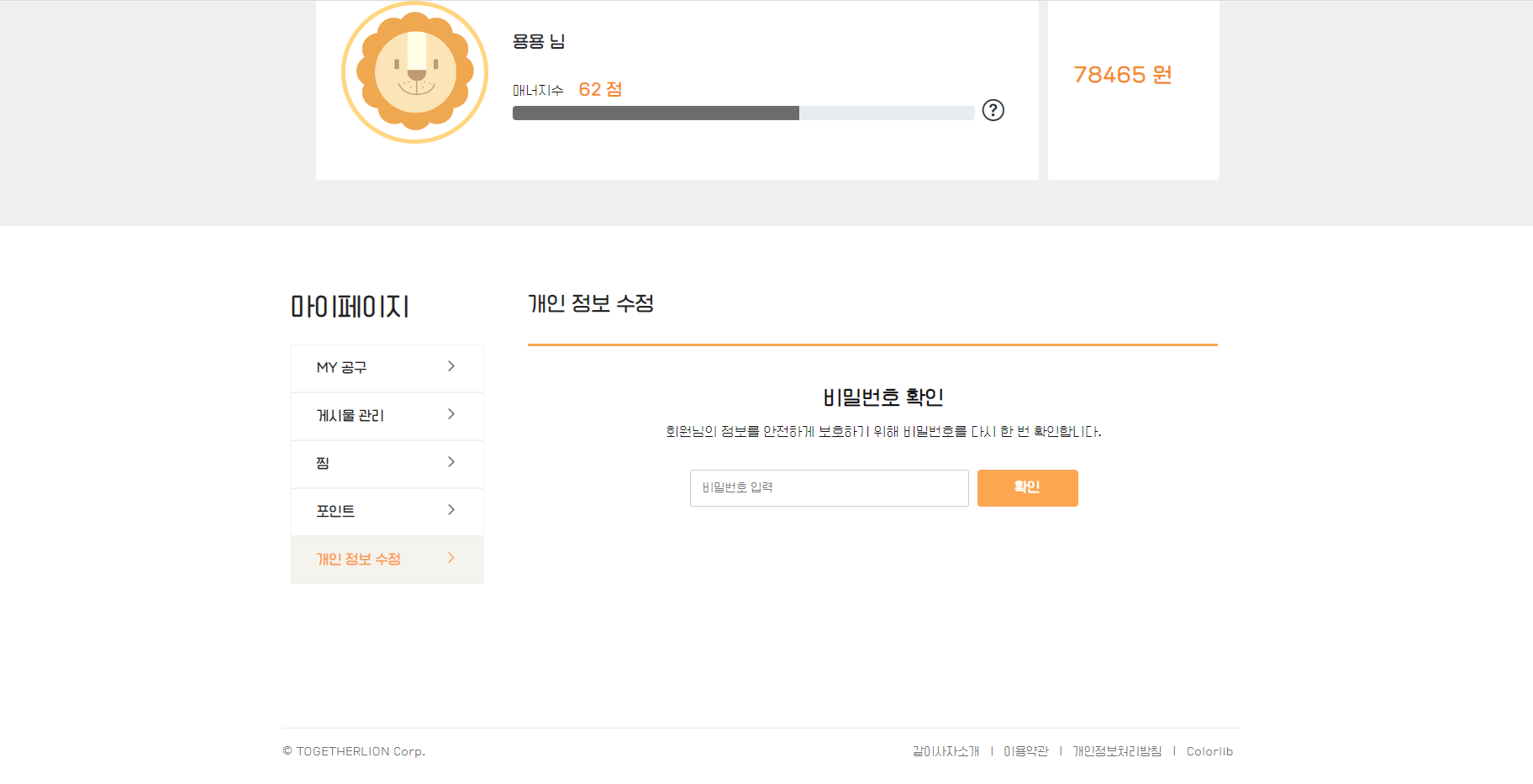 마이페이지 메뉴바에서 개인정보수정을 누르면, 회원의 비밀번호를 확인한 후에 개인정보수정폼으로 이동한다.