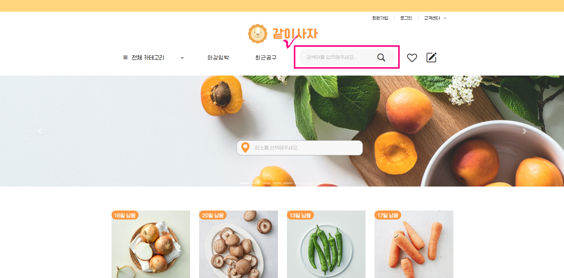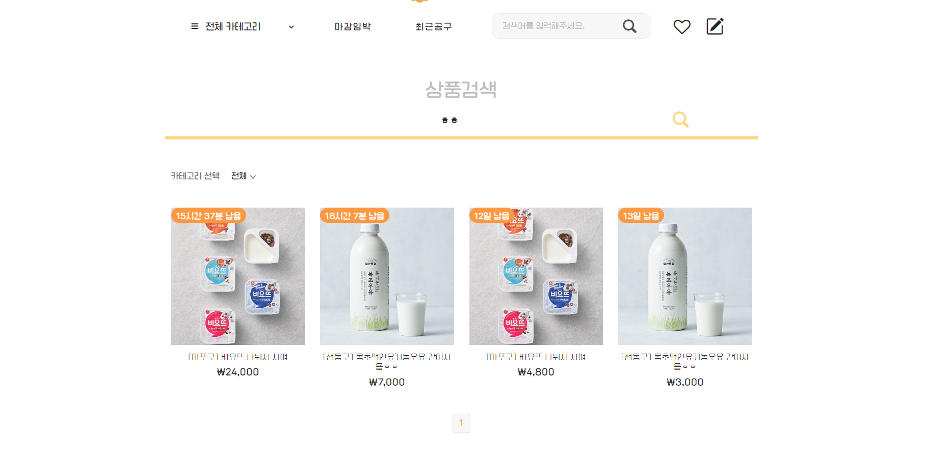 모든화면에서 따라다니는 헤더의 검색창을 통해 공동구매 게시물을 검색할 수 있다.