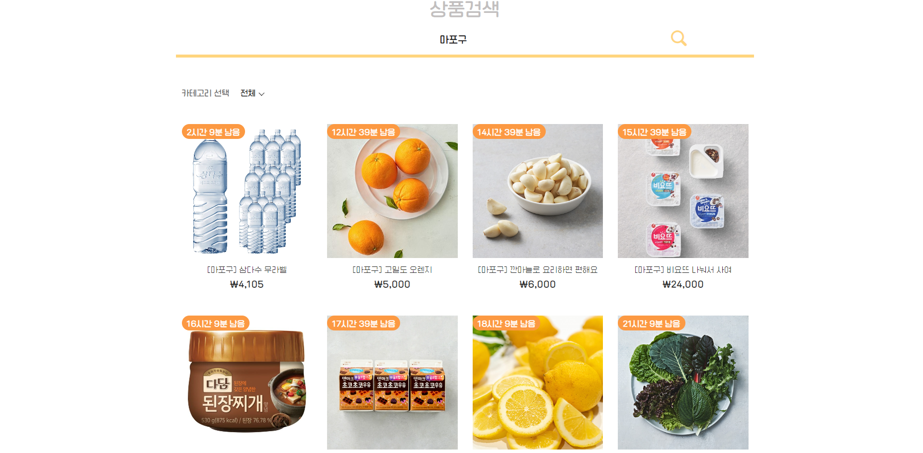아래 사진은 『마포구』 검색 후, 카테고리 『과일/채소』를 선택했을 때이다.