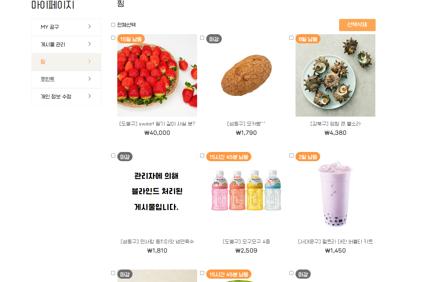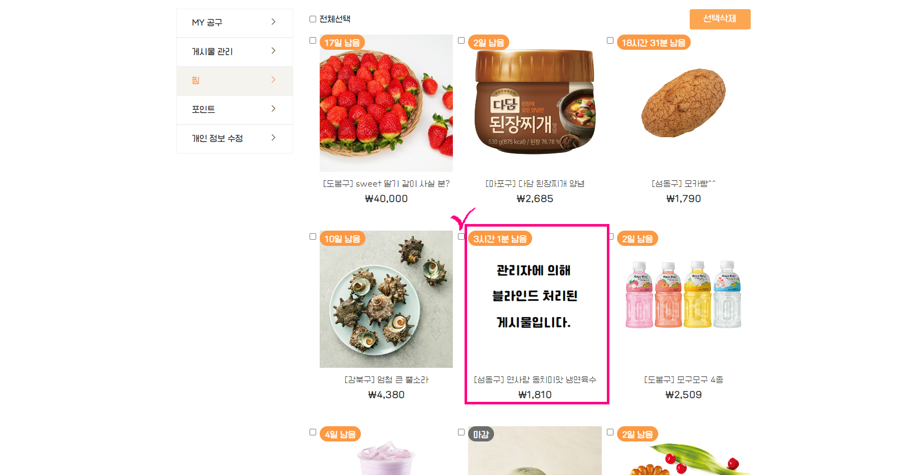 메인이나 최근공구 등의 공동구매 목록에서는 현재 모집 중이고, 블라인드 된 게시물은 보이지 않게 했지만,