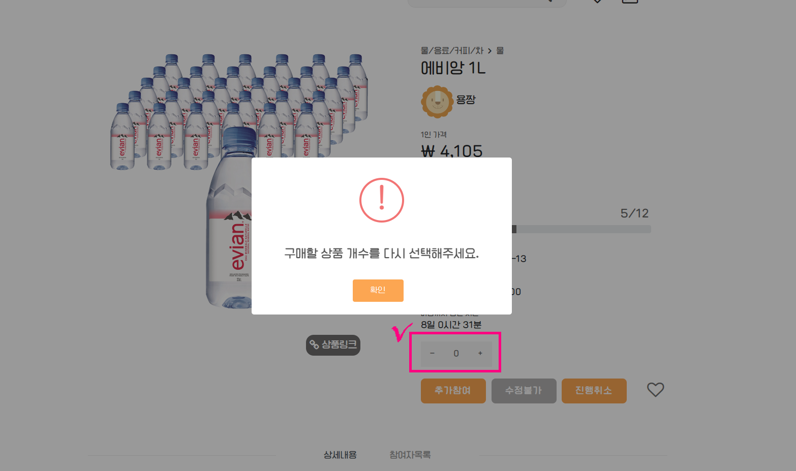 - 구매 개수 선택할 때, 0개 클릭 시 → 안내 알림 띄움 (<참여하기>, <추가참여> 둘 다 해당)