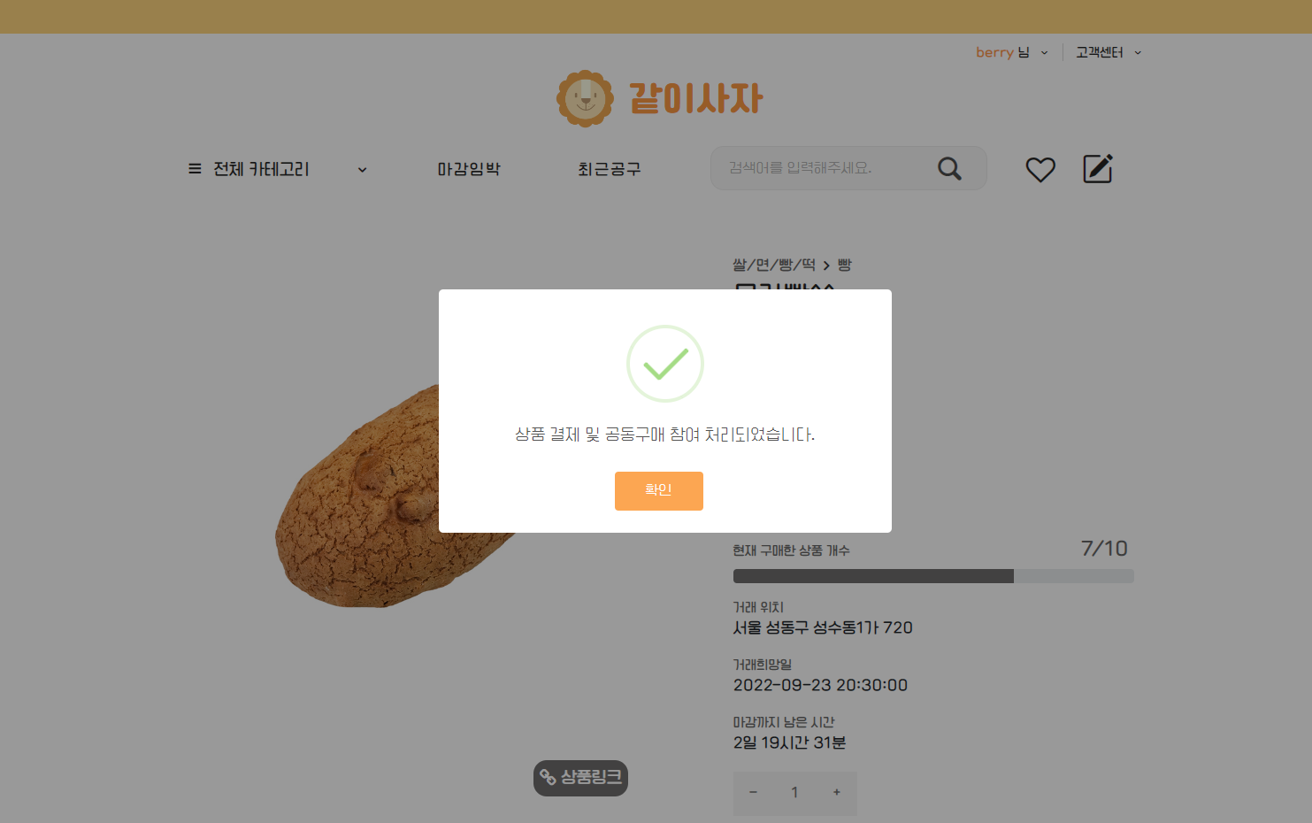 결제 및 공구 참여가 완료되었다는 알림 팝업이 뜬다.
