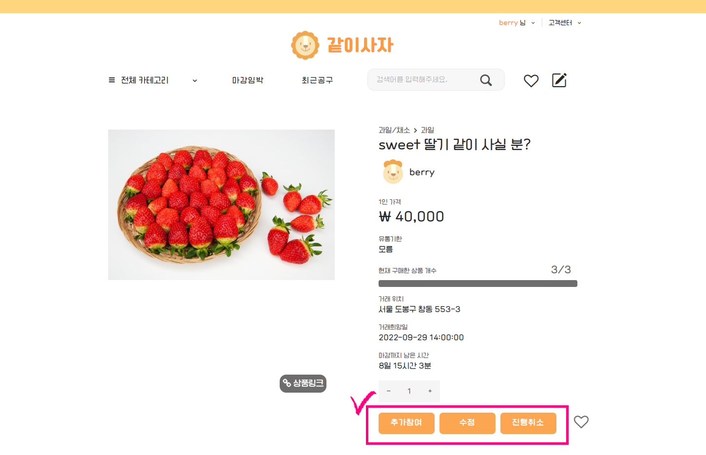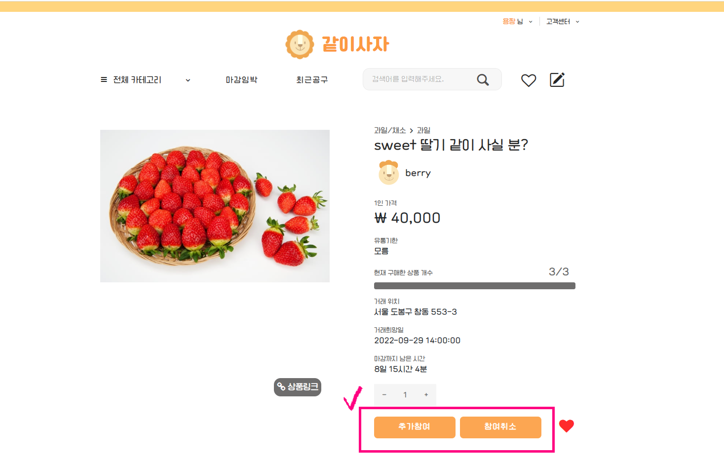 모집중인 공동구매를 먼저 살펴보면, 계속 보던 딸기 공동구매로 ㅎㅎ