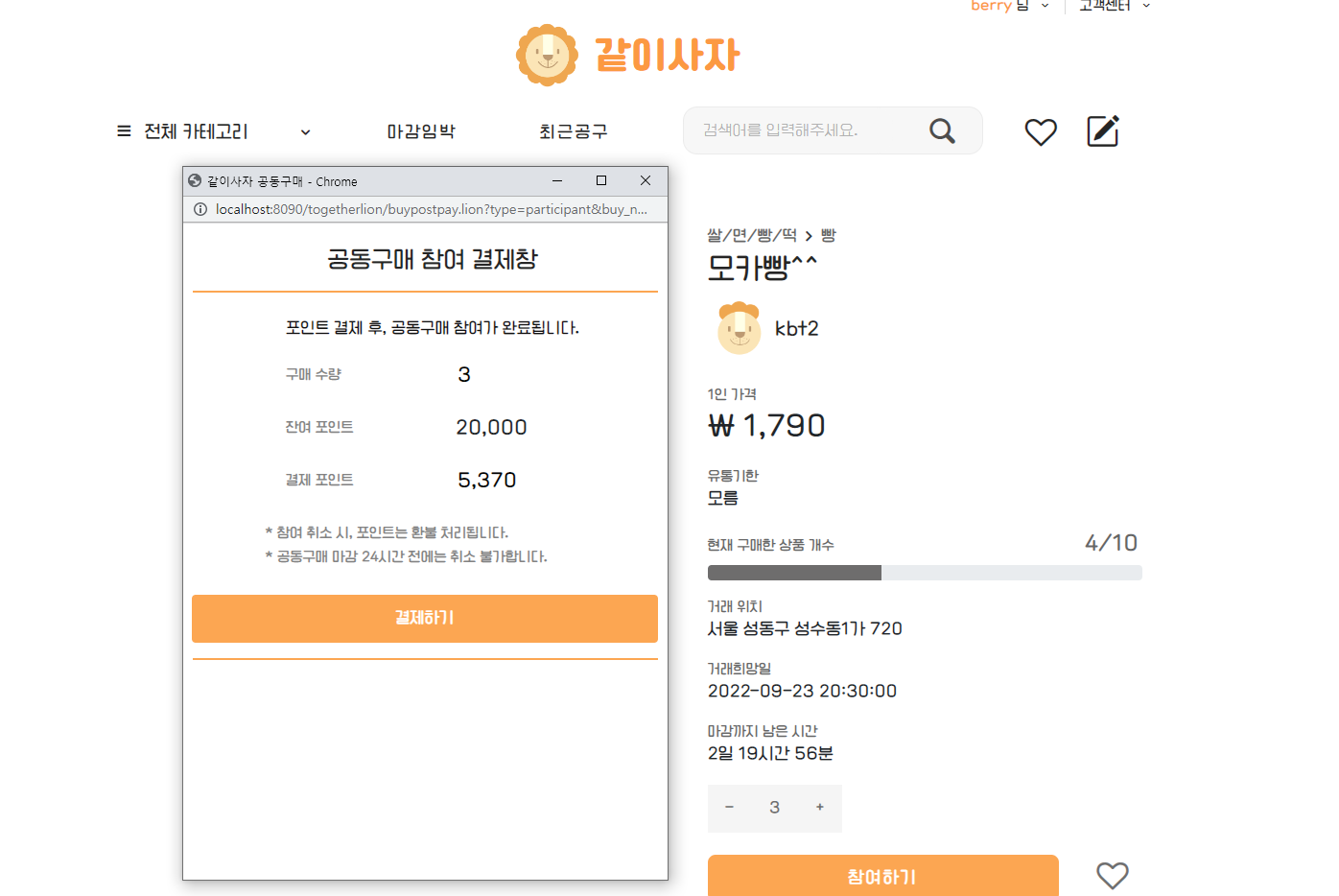 그 다음은 진행자가 공동구매 글을 작성하고 공동구매를 진행하려고 할 때 나오는 결제 팝업창의 내용이다.