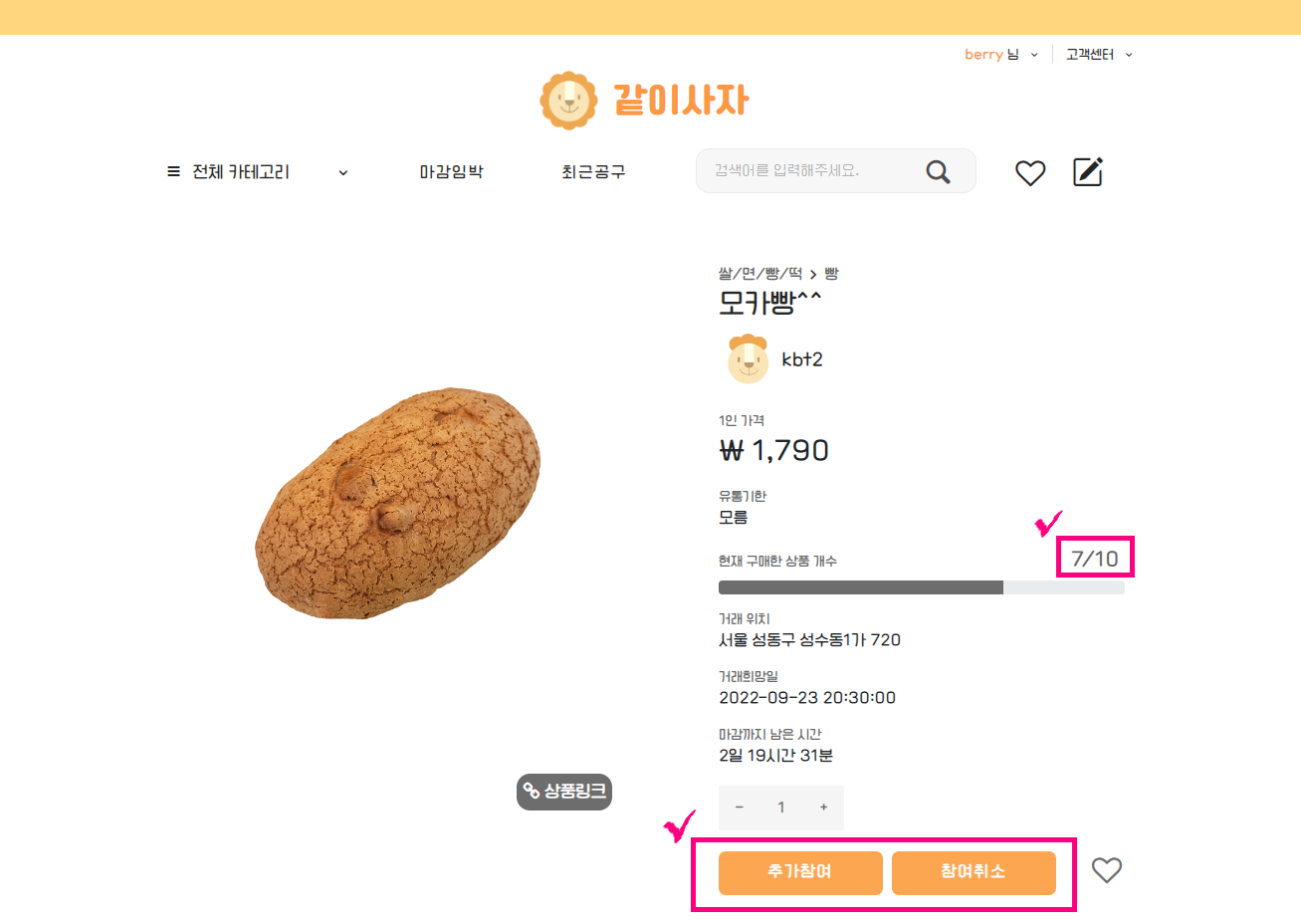 3개를 구매하여 현재 구매상품개수가 7개로 늘어났고, 버튼도 참여자에게 보이는 버튼으로 바뀌었다.