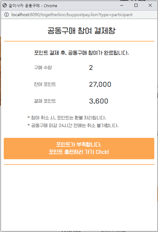 구매 수량과 결제 포인트는 공동구매 게시물로부터 받아와서 처리했고, 회원의 잔여포인트 데이터는 DB에서 가져왔다.