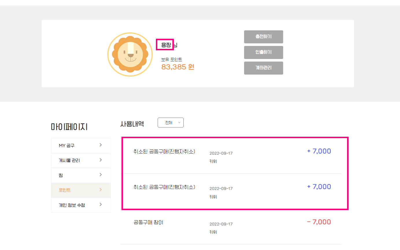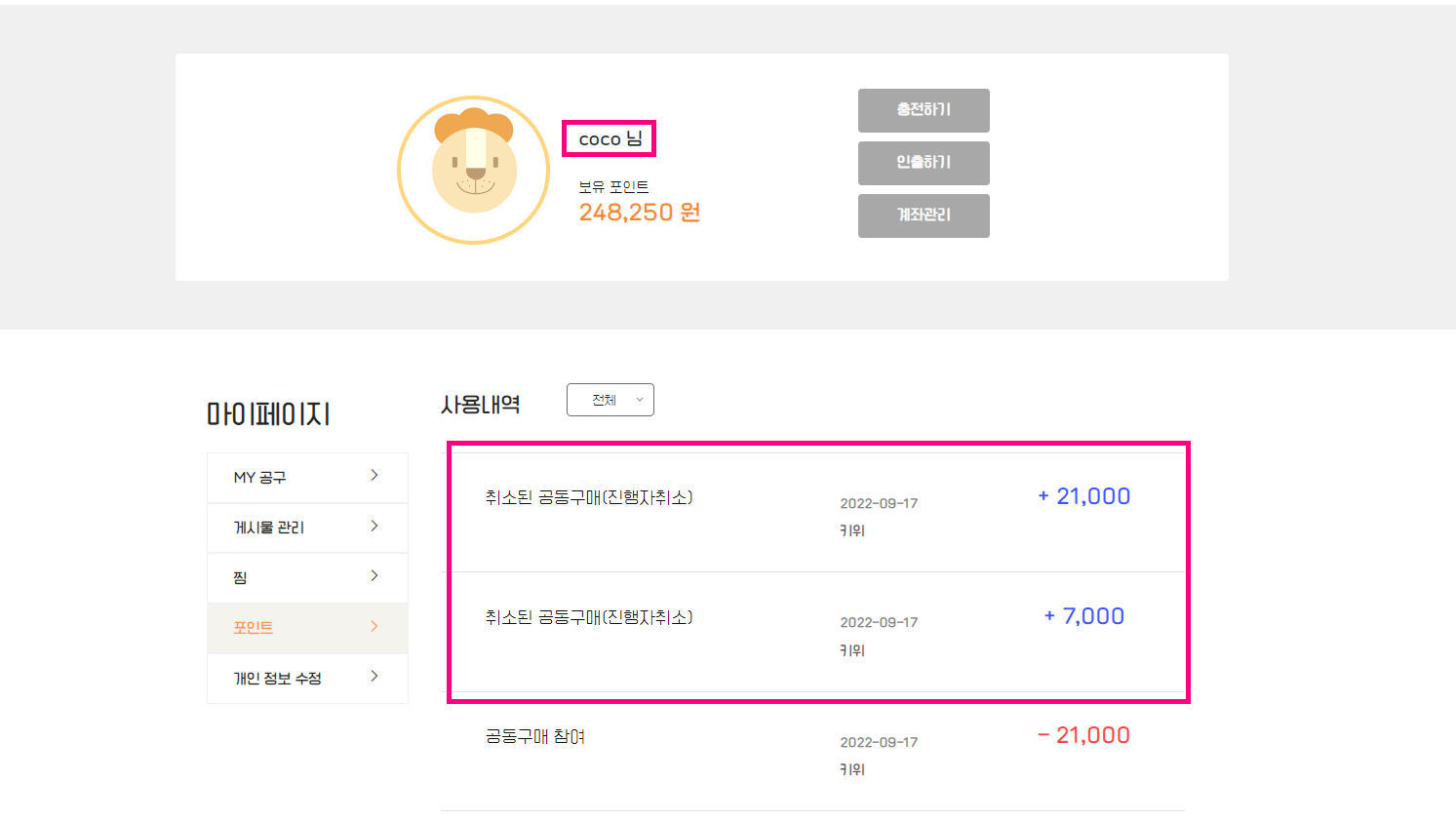 이제 제대로 환불처리가 됐는지 coco(7000+21000원), 용짱(7000+7000원), kbt2(7000+14000원) 회원의 포인트 내역을 차례로 보자