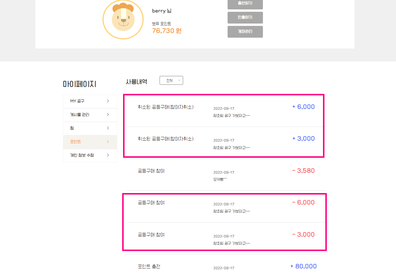 취소 후에, 포인트 내역을 보면! 장조림 공구에 참여할 때 1개사고, 추가참여로 2개를 샀기 때문에 환불도 같은 방법으로 2번 이루어졌다..! 금액을 더해서 한 번에 환불할 수 있지만 뭐 나중에 처음에는 카드결제하고 두 번째에는 계좌이체로 했으면 따로 해줘야 될 것이기 때무네,,,! ㅎㅅㅎ