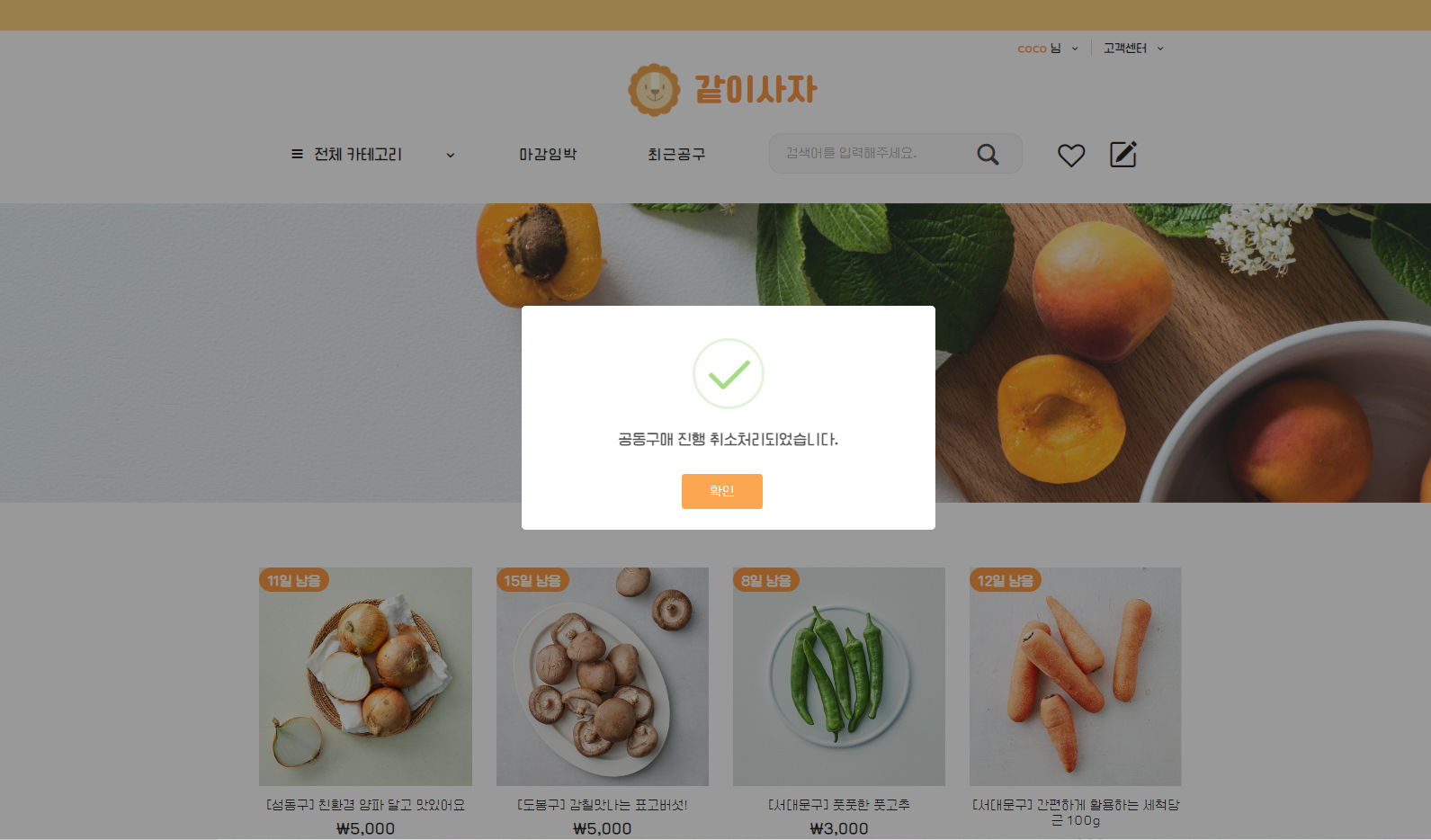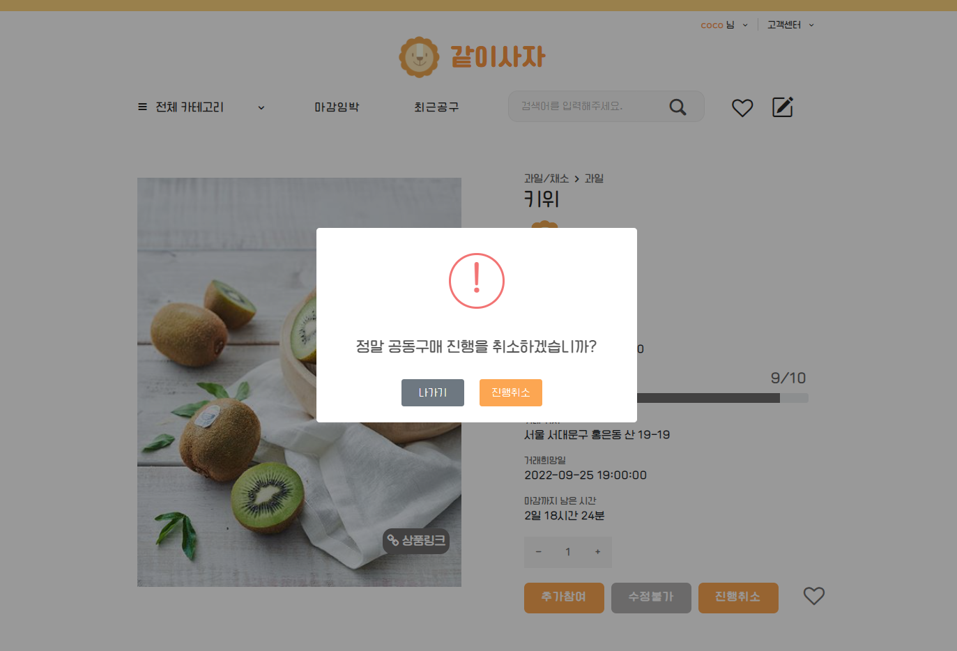 그럼 coco 회원이 진행하고 있는 '키위' 공동구매를 <진행취소> 해보자
