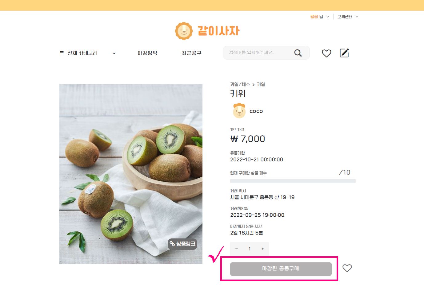 그리고 포인트 내역에 있는 공동구매 게시물 이름을 통해서 [키위] 공동구매 게시물로 들어오면,
