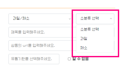 ▶ 필수 입력 사항: 대표 사진 선택, 대분류/소분류 선택, 제목, 상품URL, 유통기한입력(모르면 '알 수 없음'에 체크),