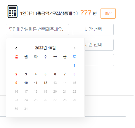 - 거래희망날짜(datepicker) + 시간(timepicker): 모집마감날짜 이후부터 14일 이내의 날짜만 선택 가능,