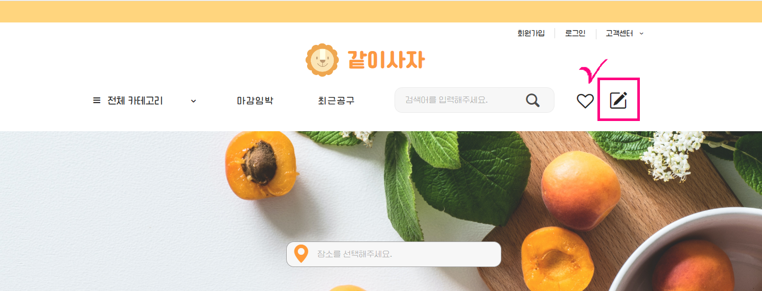 공동구매글을 작성하는 방법은 헤더에 있는 『작성』 아이콘을 클릭하면 된다. [아래 사진 참고]