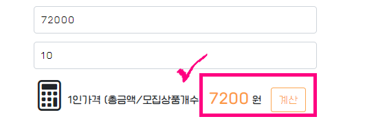 현재 금액에는 72000원, 총 모집 상품개수는 10개를 입력해서 1인당 가격은 72000/10 = 7200원으로 계산되어 보여진다.