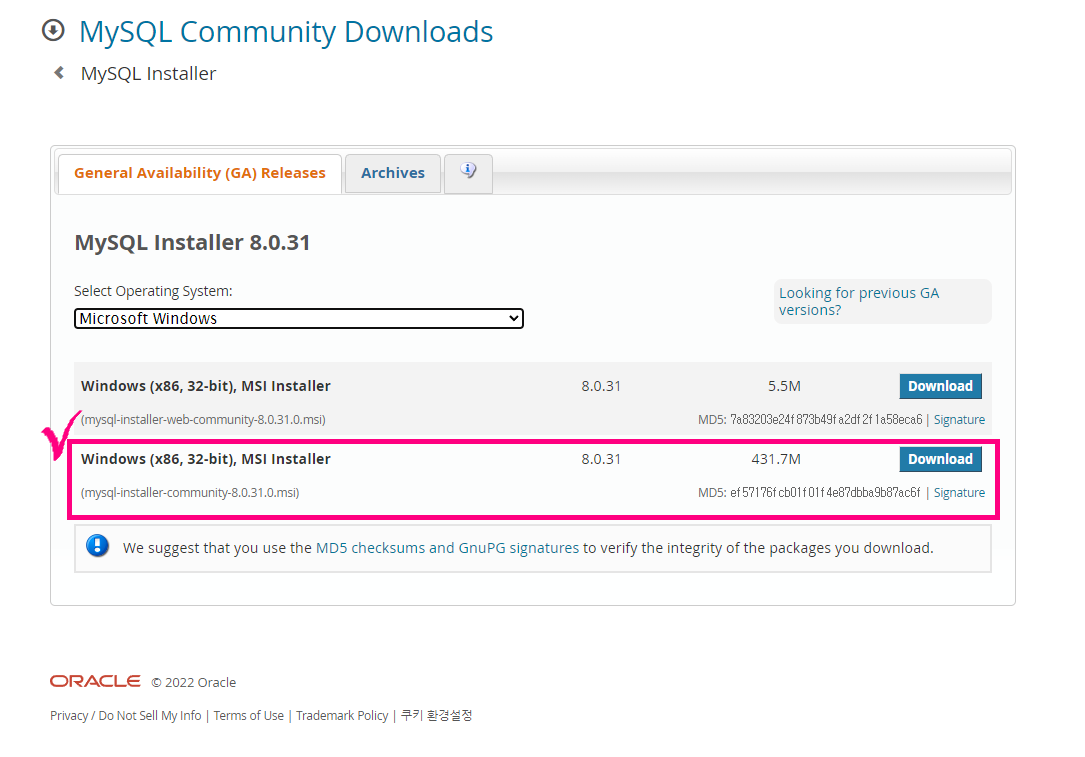 Select Operating System: Select Operating System… Microsoft Windows Select OS Version: All Windows (x86, 32-bit) Windows (x86, 32-bit), MSI Installer 8.0.31 5.5M (mysql-installer-web-community-8.0.31.0.msi) MD5: 7a83203e24f873b49fa2df2f1a58eca6 | Signatu