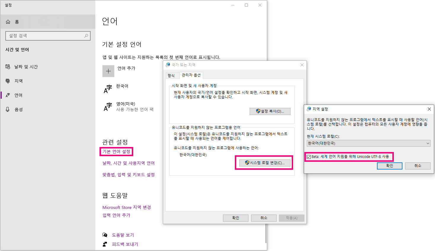 윈도우 설정 > 언어 > 기본 언어 설정 > 관리자 옵션 - 시스템 로캘 변경 > Unicode UTF-8 사용에 체크 설정해준 뒤,