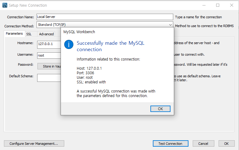 ④ [Test Connection] 클릭해서 'Successfully made the MySQL connection' 팝업 뜨는거 확인하면 접속 테스트 완료!