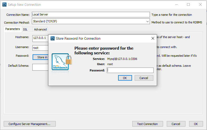 Connection Name 입력하고, Hostname은 local이기 때문에 127.0.0.1 로 그냥 놔두면 된다.