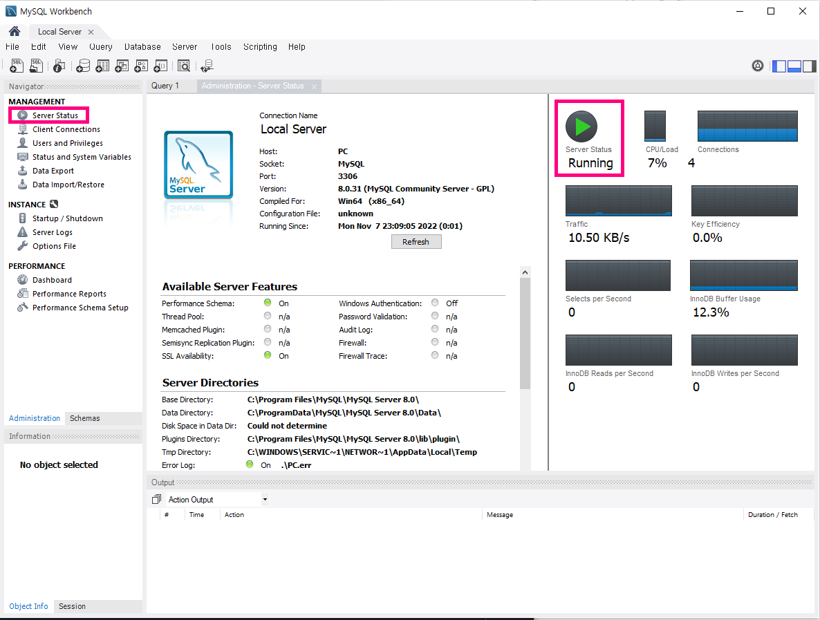 새로 만든 Connection을 클릭 후, 좌측 Navigator에서 MANAGEMENT > Server Status 를 클릭했는데