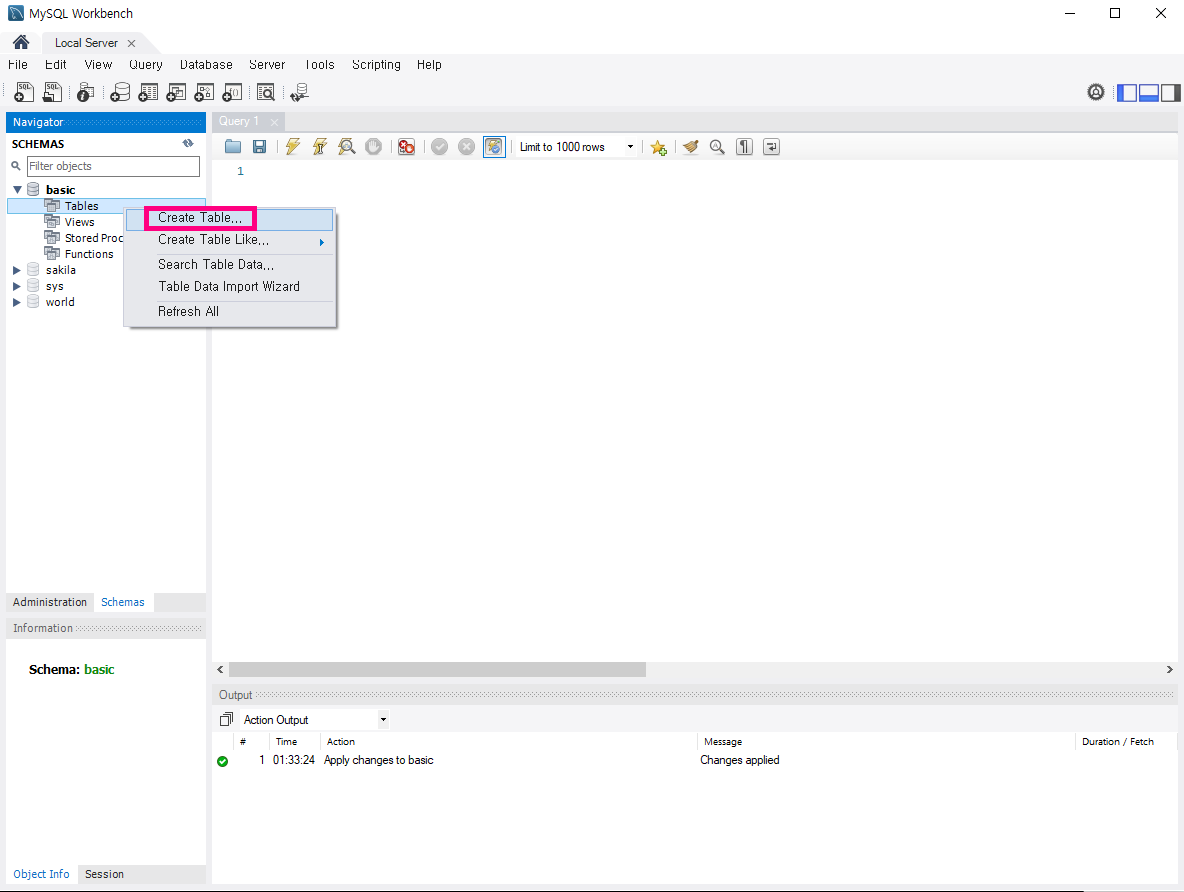 ① 테이블을 생성할 스키마의 Tables에서 우클릭 > [Create Table...] 클릭
