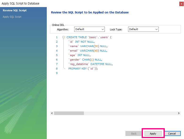 - Column Name, Datatype, Option 설정한 다음에, [Apply] 클릭