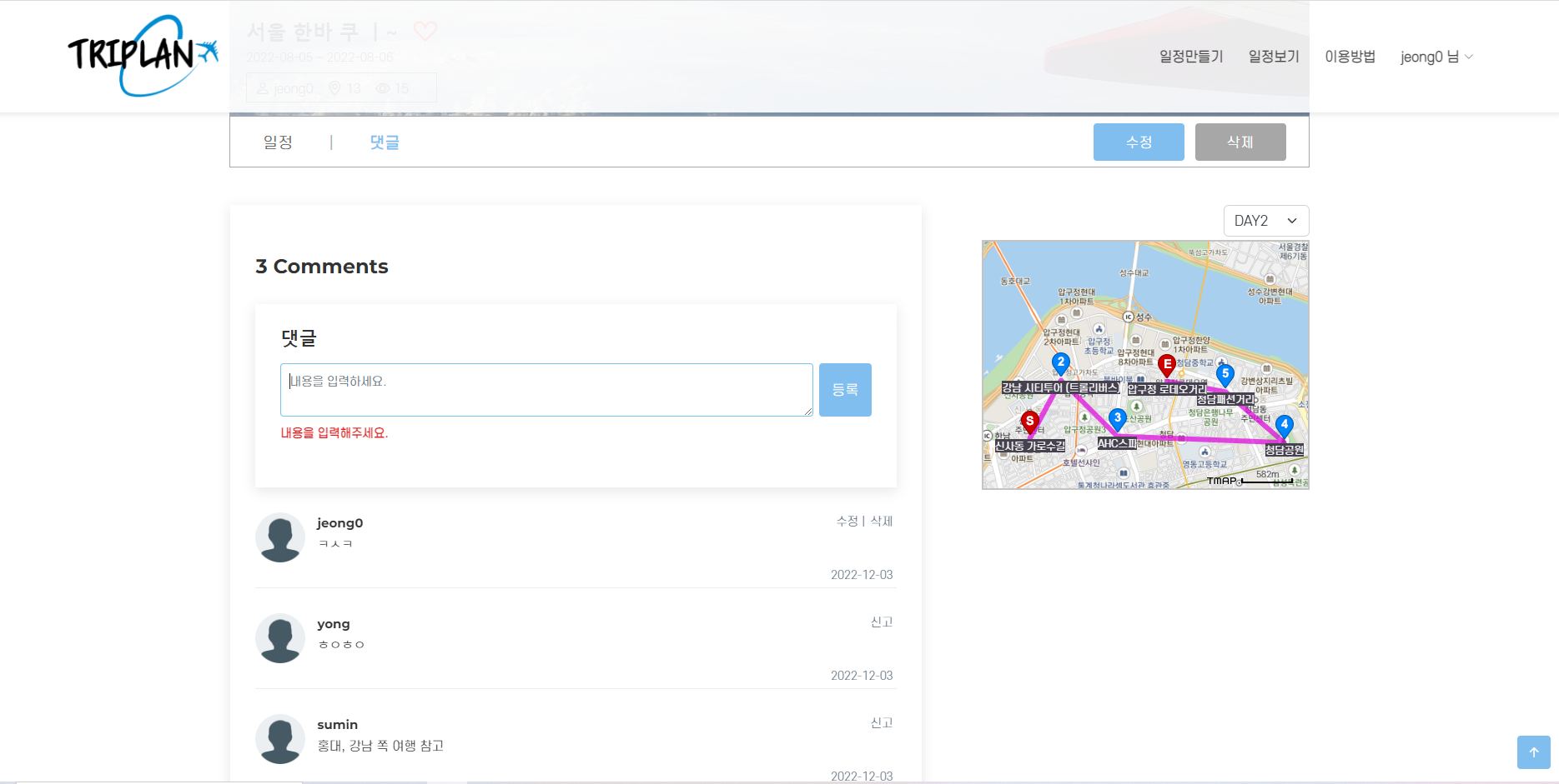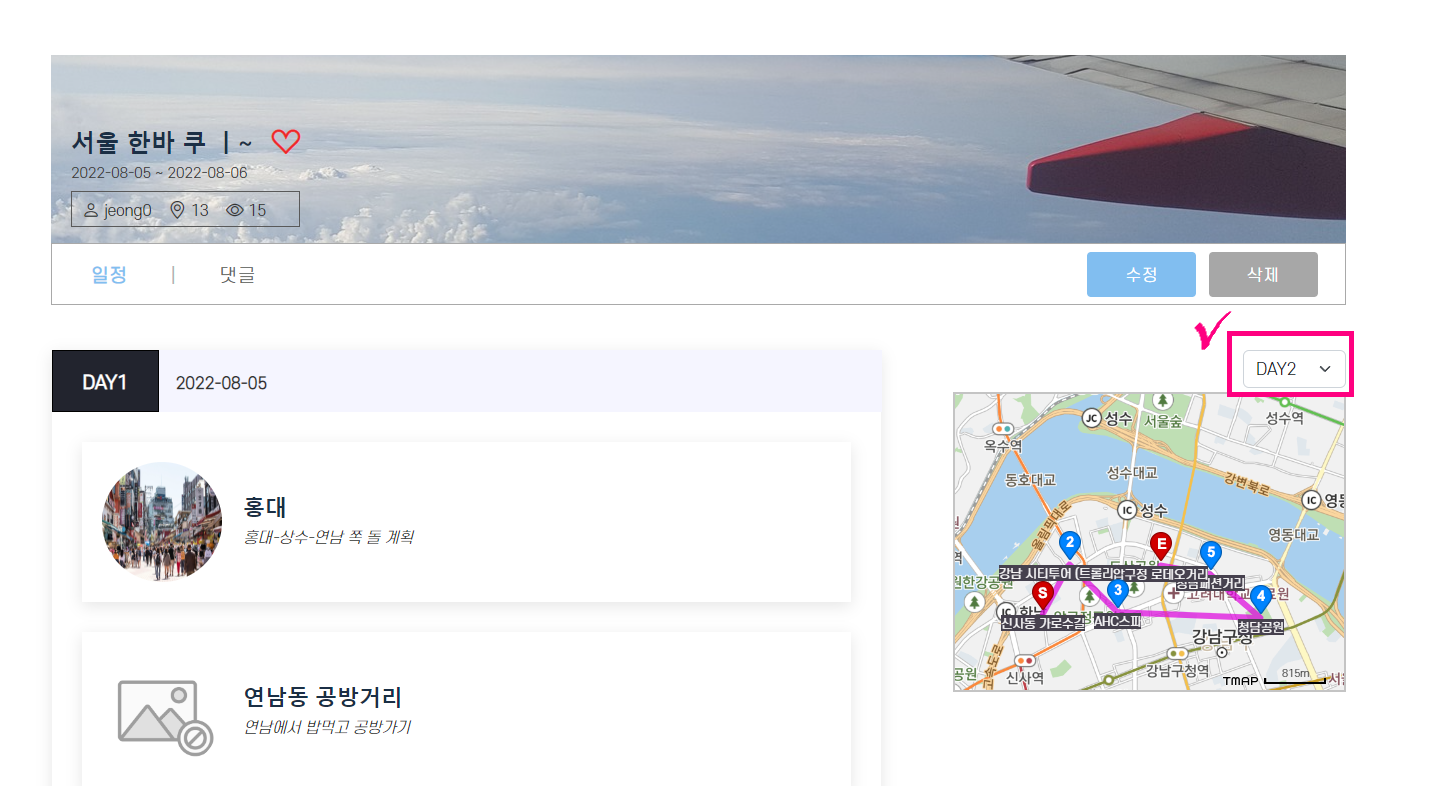 우측의 지도에는 selectbox에 각 DAY를 선택하면, 해당 날짜에 가는 지역들의 경유 순서를 보여준다.