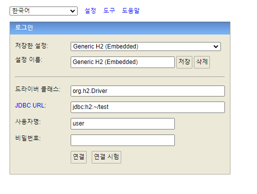 JDBC URL 에 jdbc:h2:~/test 입력 후, <연결>