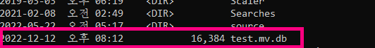 그리고 cmd 창에 dir 입력해서 test.mv.db 파일이 생성된 걸 확인하면 된다.